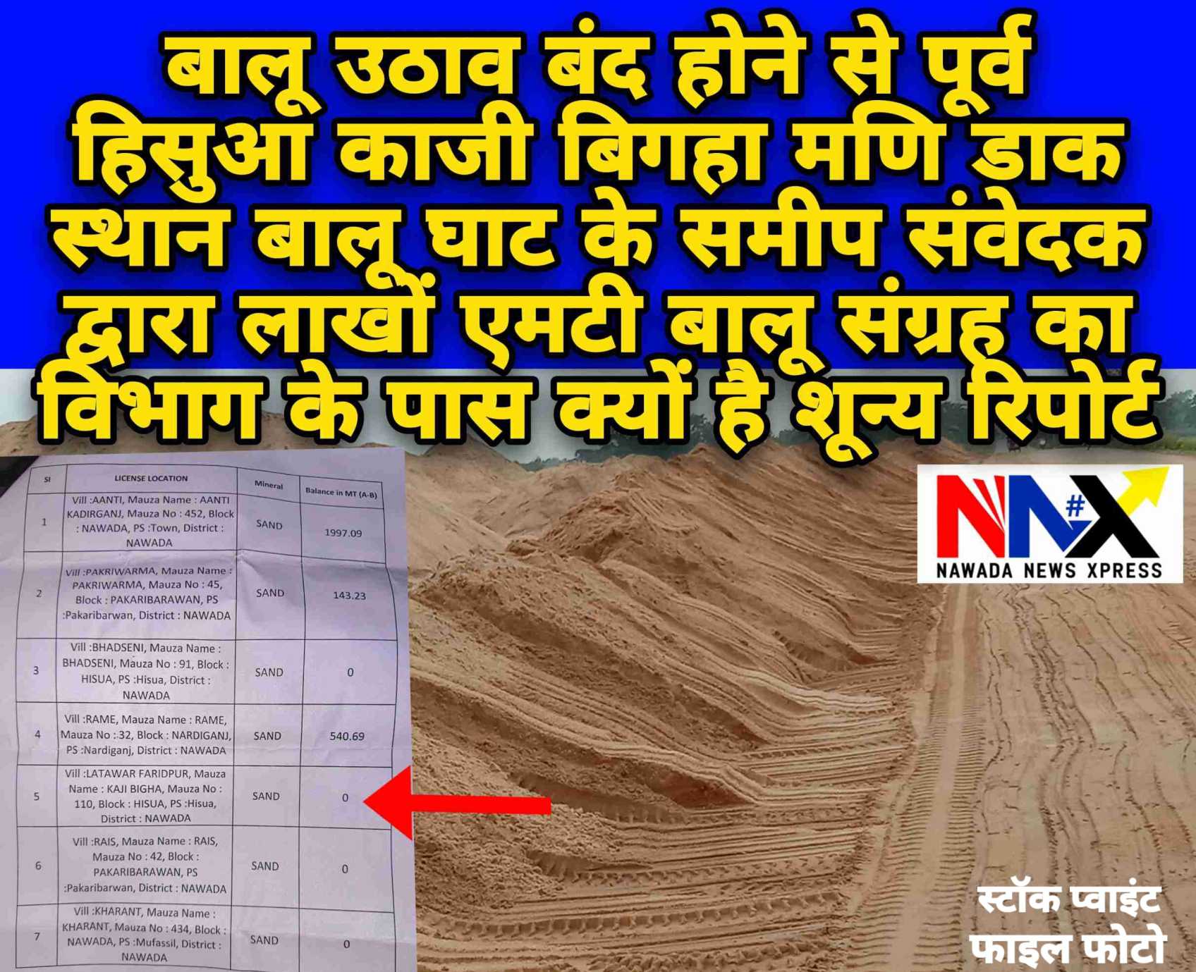नवादा में चार माह बंद रहेगा नदी से बालू उठाव, विभागीय स्तर पर महज 285875.82 एमटी ही बालू हो सका स्टॉक प्वाइंट पर जमा, इतनी कम बालू से कैसे होगा जिलेवासियों की आपूर्ति