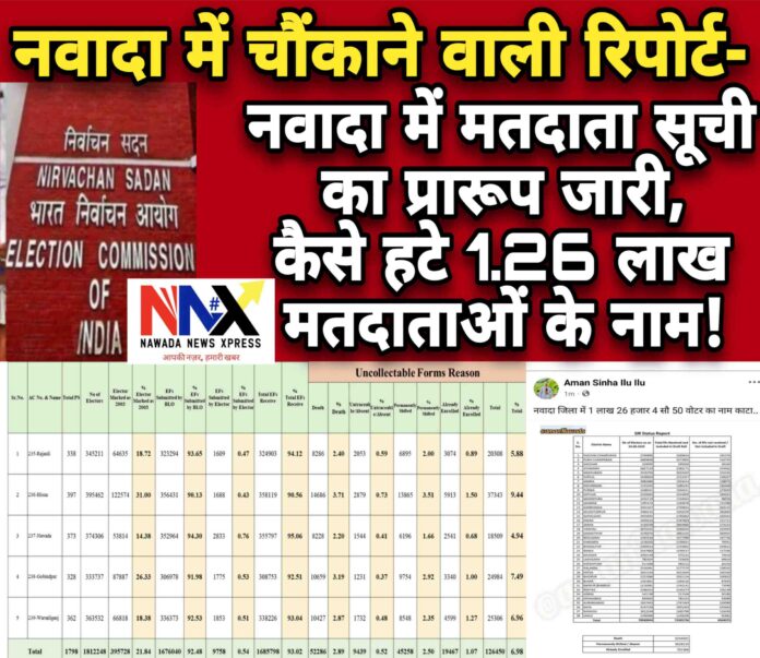 विशेष गहन पुनरीक्षण कार्यक्रम के तहत शुक्रवार को नवादा जिले की मतदाता सूची का प्रारूप प्रकाशित कर दिया गया है। इस सूची में जिले के 1 लाख 26 हजार 450 मतदाताओं के नाम हटाए गए हैं।