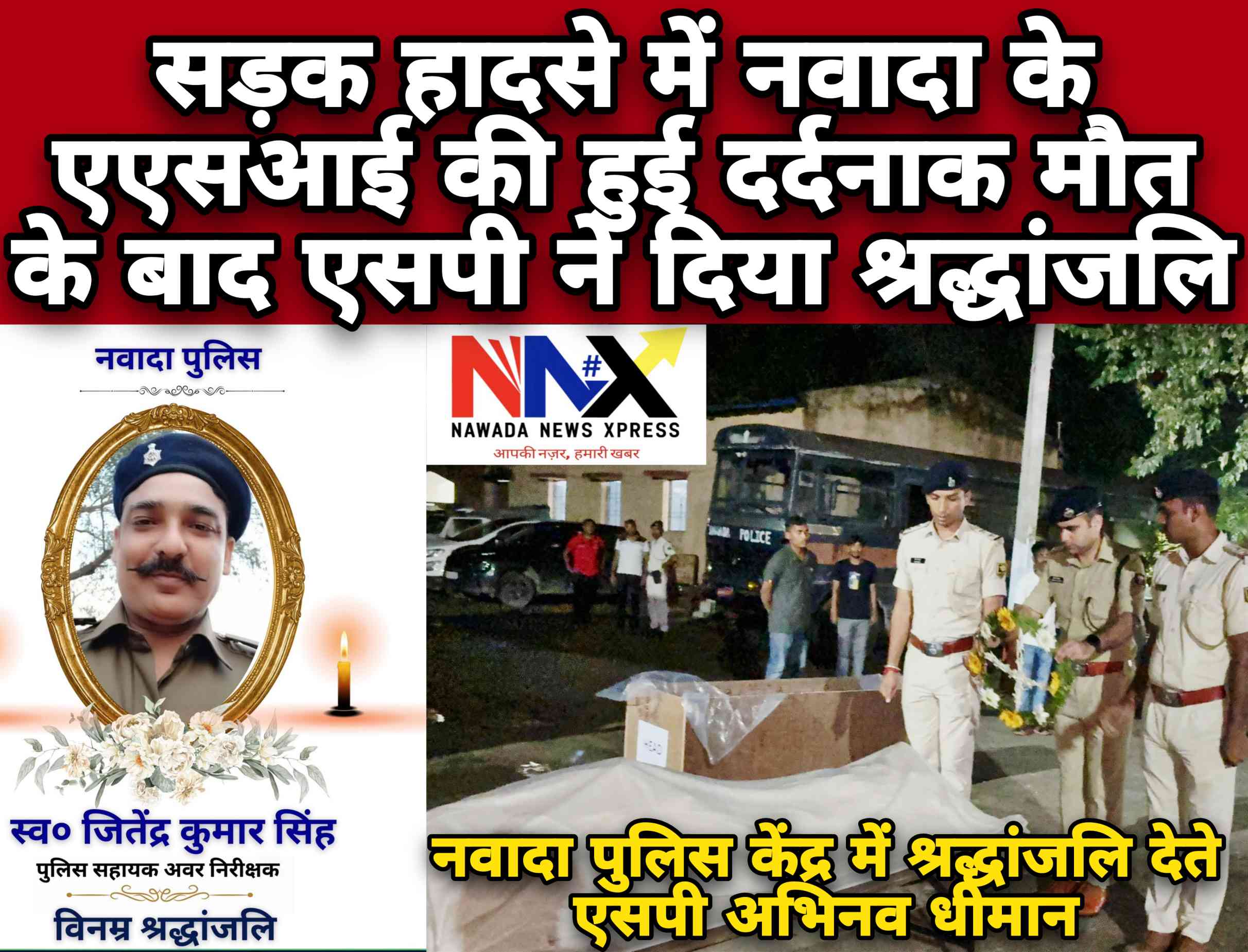 वहीं मृतक एएसआई जीतेन्द्र का पार्थिव शरीर नवादा पुलिस केंद्र लाया गया, एसपी अभिनव धीमान सहित अन्य पुलिस पदाधिकारियों व जवानों ने नम आंखों से श्रद्धांजलि दी। उनके असामयिक निधन से पुलिस विभाग और उनके साथियों में शोक की लहर है।
