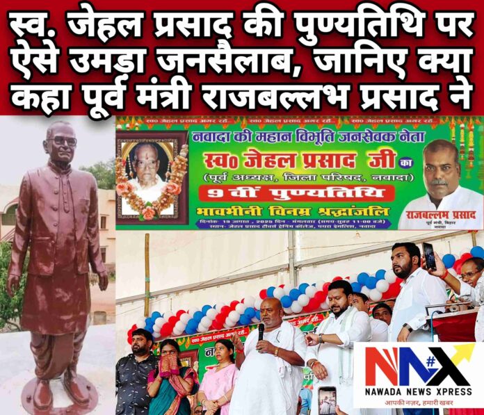 जनसेवक और दीनबंधु स्व. जेहल प्रसाद की 9वीं पुण्य स्मृति दिवस पर मंगलवार को नवादा के पथरा इंग्लिश स्थित स्मारक स्थल पर श्रद्धा और सम्मान का सैलाब उमड़ पड़ा।