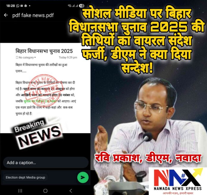 व्हाट्सएप व अन्य सोशल मीडिया प्लेटफॉर्म पर “बिहार विधानसभा चुनाव 2025” की तिथियों को लेकर प्रसारित संदेश पूरी तरह भ्रामक और फर्जी (Fake) हैं।