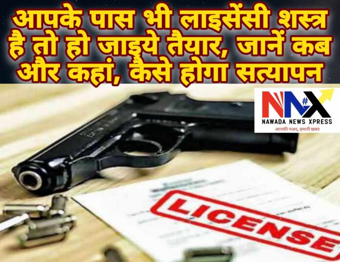 नवादा में आगामी विधानसभा आम निर्वाचन-2025 के दौरान विधि-व्यवस्था सुदृढ़ रखने तथा शांतिपूर्ण एवं भयमुक्त वातावरण सुनिश्चित करने के लिए जिले के सभी शस्त्र अनुज्ञप्तिधारियों को अपने-अपने शस्त्रों का भौतिक सत्यापन कराना अनिवार्य कर दिया गया है।