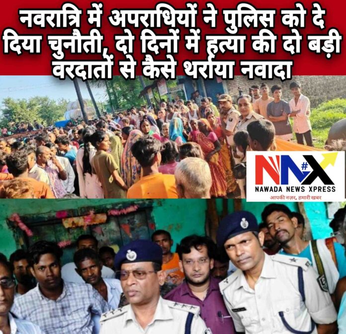नवादा जिले में नवरात्रि पर अपराधियों ने पुलिस को बड़ी चुनौती दे दिया है। पिछले दो दिनों में हुई दोहरी हत्या कांड से पूरा जिला थर्रा उठा है। पहले विख्यात महिला चिकित्सक डॉ अरूंधती के नाती पुष्पांशु कुमार की अज्ञात अपराधियों ने ग्लाइंडर मशीन से गला रेतकर हत्या कर दी।