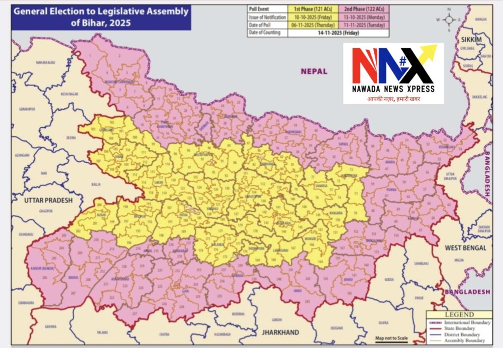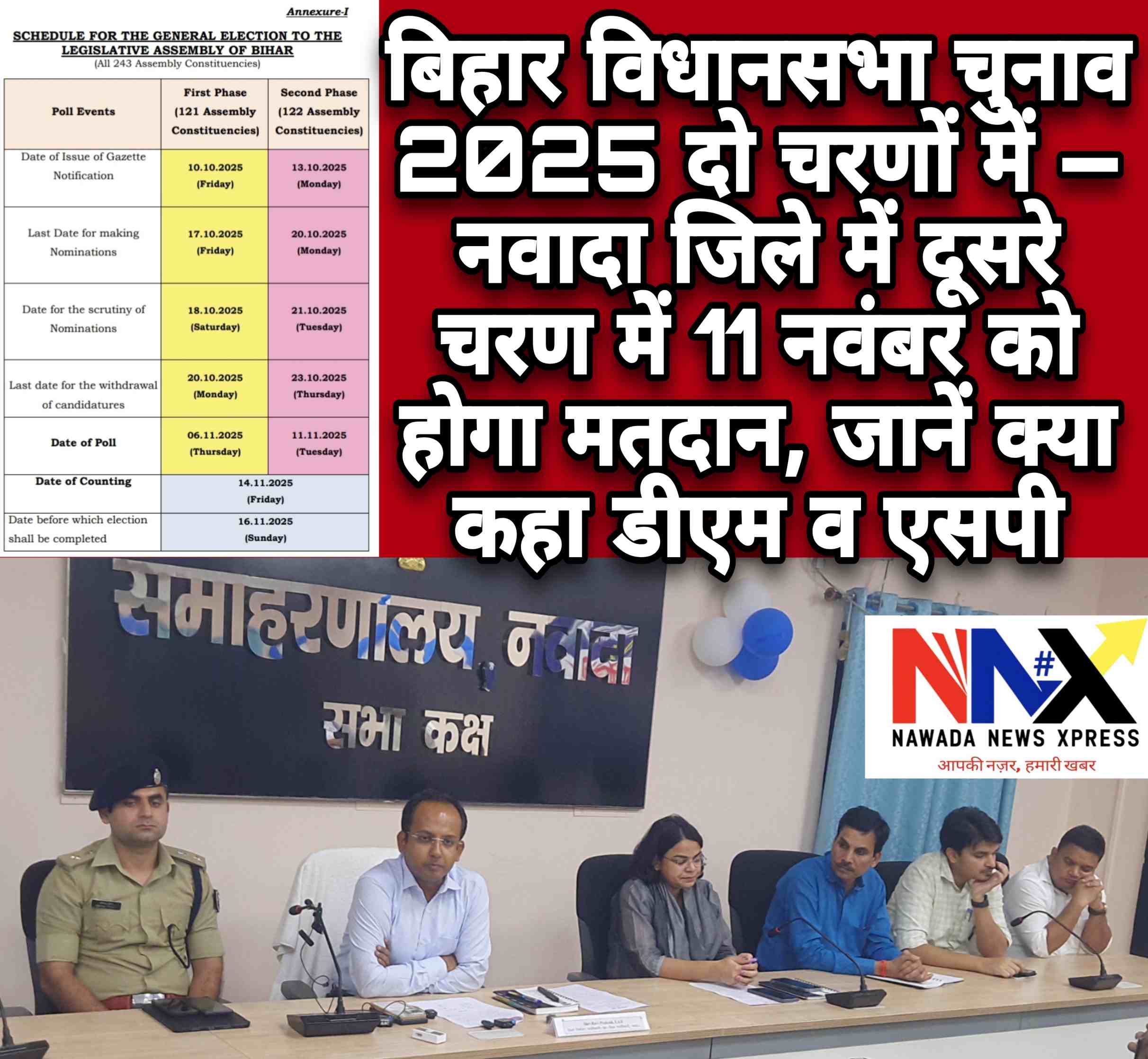 भारत निर्वाचन आयोग, नई दिल्ली द्वारा बिहार विधानसभा चुनाव 2025 की घोषणा के साथ ही आदर्श आचार संहिता पूरे राज्य में लागू हो गई है। जिसको लेकर डीएम रवि प्रकाश व एसपी अभिनव धीमान ने मीडिया को बताया कि आयोग की प्रेस नोट संख्या ECI/PN/316/2025 के अनुसार बिहार में चुनाव दो चरणों में होंगे। नवादा जिला दूसरे चरण में शामिल है, जहां मतदान 11 नवंबर 2025 (मंगलवार) को होगा।