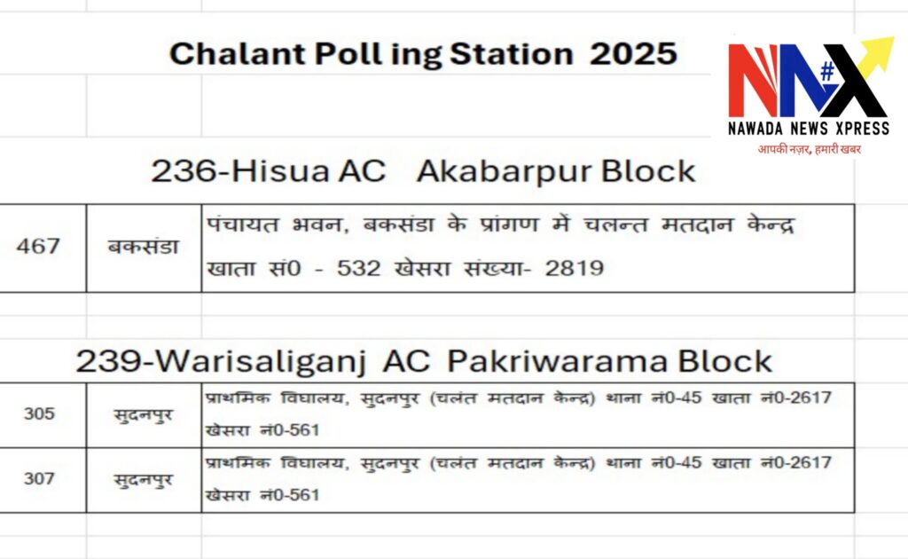 235 – राजौली (SC) विधानसभा में कुल मतदान केंद्रों की संख्या- 399 है, जिसका निर्वाची पदाधिकारी अनुमंडल पदाधिकारी, राजौली होंगे। 236 – हिसुआ विधानसभा में कुल मतदान केंद्रों की संख्या- 485 है, जिसका निर्वाची पदाधिकारी अपर समाहर्ता सह उप निर्वाचन पदाधिकारी, नवादा होंगे। 237 – नवादा विधानसभा में कुल मतदान केंद्रों की संख्या- 458 है, जिसका निर्वाची पदाधिकारी अनुमंडल पदाधिकारी, नवादा सदर होंगे। 238 – गोविंदपुर विधानसभा में कुल मतदान केंद्रों की संख्या- 404 है, जिसका निर्वाची पदाधिकारी उप विकास आयुक्त, नवादा होंगे। 239 – वारिसलीगंज विधानसभा में कुल मतदान केंद्रों की संख्या- 423 है, जिसका निर्वाची पदाधिकारी भूमि सुधार उप समाहर्ता, नवादा होंगे। इस प्रकार जिले के सभी पांचो विधानसभा मिलाकर कुल मतदान केंद्रों की संख्या- 2169 है।