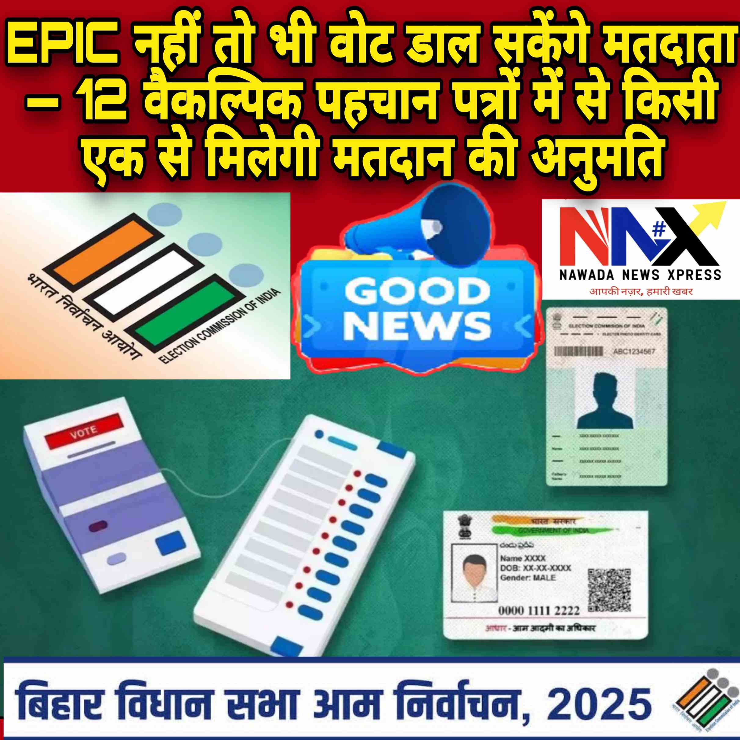 बिहार विधानसभा आम निर्वाचन के मद्देनज़र भारत निर्वाचन आयोग ने मतदाताओं की सुविधा को ध्यान में रखते हुए बड़ा निर्णय लिया है। जिन मतदाताओं के नाम निर्वाचक नामावली में दर्ज हैं, लेकिन वे मतदान के दिन अपना मतदाता पहचान पत्र (EPIC) प्रस्तुत करने में असमर्थ होंगे, वे 12 वैकल्पिक फोटो पहचान पत्रों में से किसी एक को प्रस्तुत कर मतदान कर सकेंगे। राज्य में लगभग 100 प्रतिशत मतदाताओं को EPIC पहले ही जारी किए जा चुके हैं। साथ ही आयोग ने निर्देश दिया है कि अंतिम निर्वाचक नामावली के प्रकाशन के 15 दिनों के भीतर सभी नए मतदाताओं को भी EPIC वितरित कर दिया जाए।