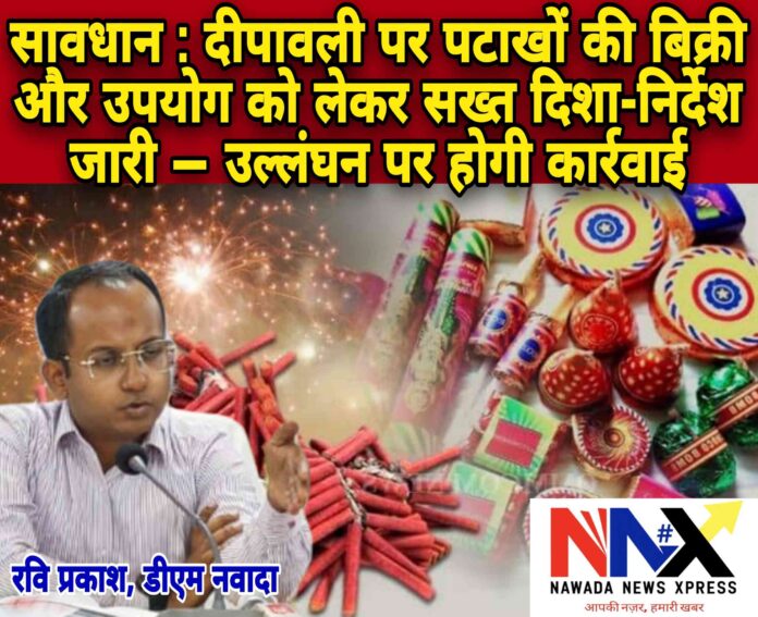 नवादा जिला पदाधिकारी रवि प्रकाश ने दीपावली को लेकर सख्त निर्देश जारी कर दिया है। उन्होंने बताया कि इस वर्ष दीपावली का त्योहार 20 अक्टूबर 2025 को मनाया जाएगा। दीपावली के अवसर पर अक्सर देखा जाता है कि संकीर्ण बाजारों, गलियों और भीड़-भाड़ वाले इलाकों में पटाखों की अव्यवस्थित बिक्री के कारण आगजनी या अन्य दुर्घटनाएं हो जाती हैं। इसको देखते हुए गृह विभाग, बिहार पटना की ओर से पटाखों की बिक्री, भंडारण एवं उपयोग को लेकर दिशा-निर्देश जारी किए गए हैं।