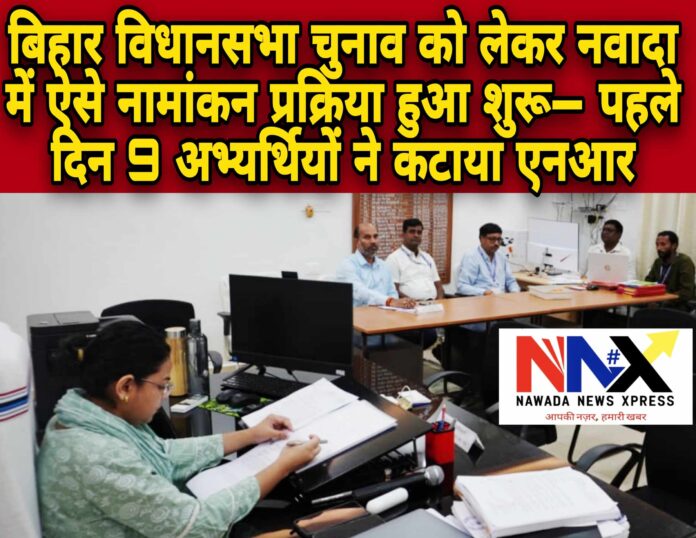 235-रजौली (अ.जा.) में शून्य एनआर, नामांकन भी शून्य रहा। 236-हिसुआ में एक एनआर आजाद गीता प्रसाद शर्मा ने कटाया। नामांकन शून्य रहा। 237-नवादा में 2 एनआर- मुमताज आलम व रविश कुमार ने कटाया, नामांकन शून्य रहा। 238-गोविंदपुर में एक भी एनआर नहीं कटा और नामांकन भी शून्य रहा। 239-वारिसलीगंज में 6 एनआर- बब्लू कुमार, अनिता, नयन कुमार, सकलदेव यादव, उमाकांत तथा अरुणा देवी ने कटाया, नामांकन एक भी नहीं हुआ। इस तरह से नामांकन के पहले दिन कुल 9 अभ्यर्थियों ने एनआर कटाया, परंतु किसी भी विधानसभा में नामांकन एक भी नहीं हुआ।