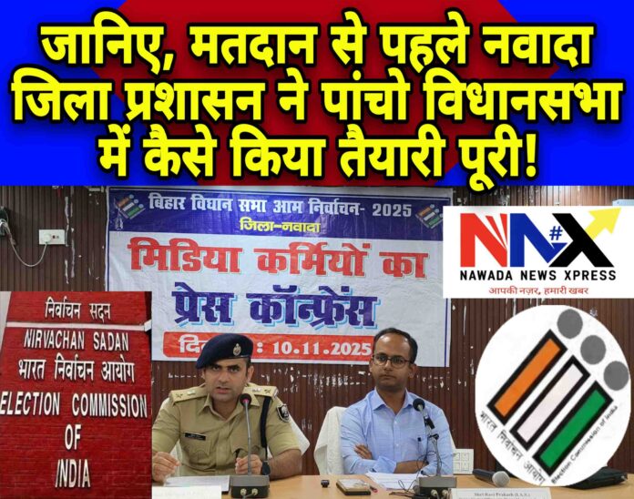 बिहार विधानसभा आम निर्वाचन 2025 के द्वितीय चरण में नवादा जिले की पाँचों विधानसभा सीटों — राजौली (SC-235), हिसुआ (236), नवादा (237), गोविंदपुर (238) और वारिसलीगंज (239) पर 11 नवम्बर 2025 (मंगलवार) को मतदान होना है। जिला प्रशासन ने शांतिपूर्ण, निष्पक्ष और पारदर्शी मतदान के लिए सभी तैयारियाँ पूरी कर ली हैं।