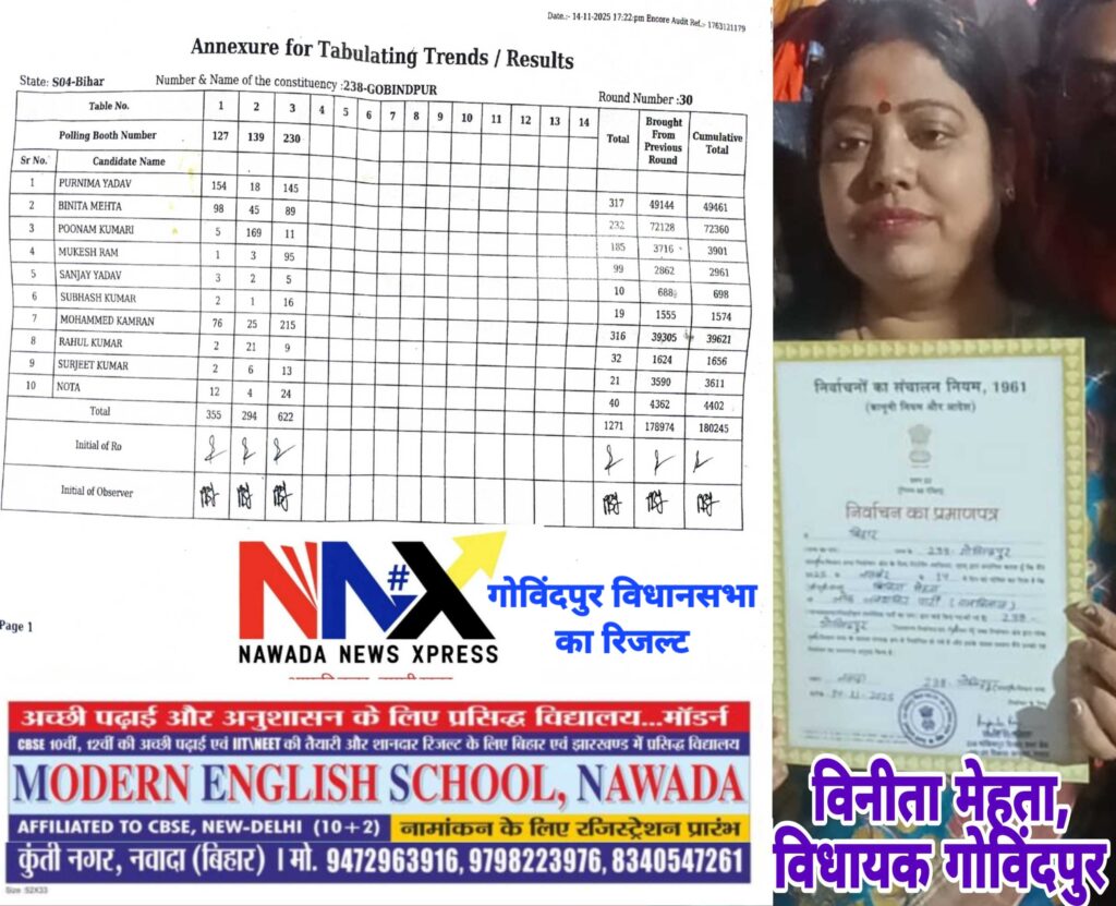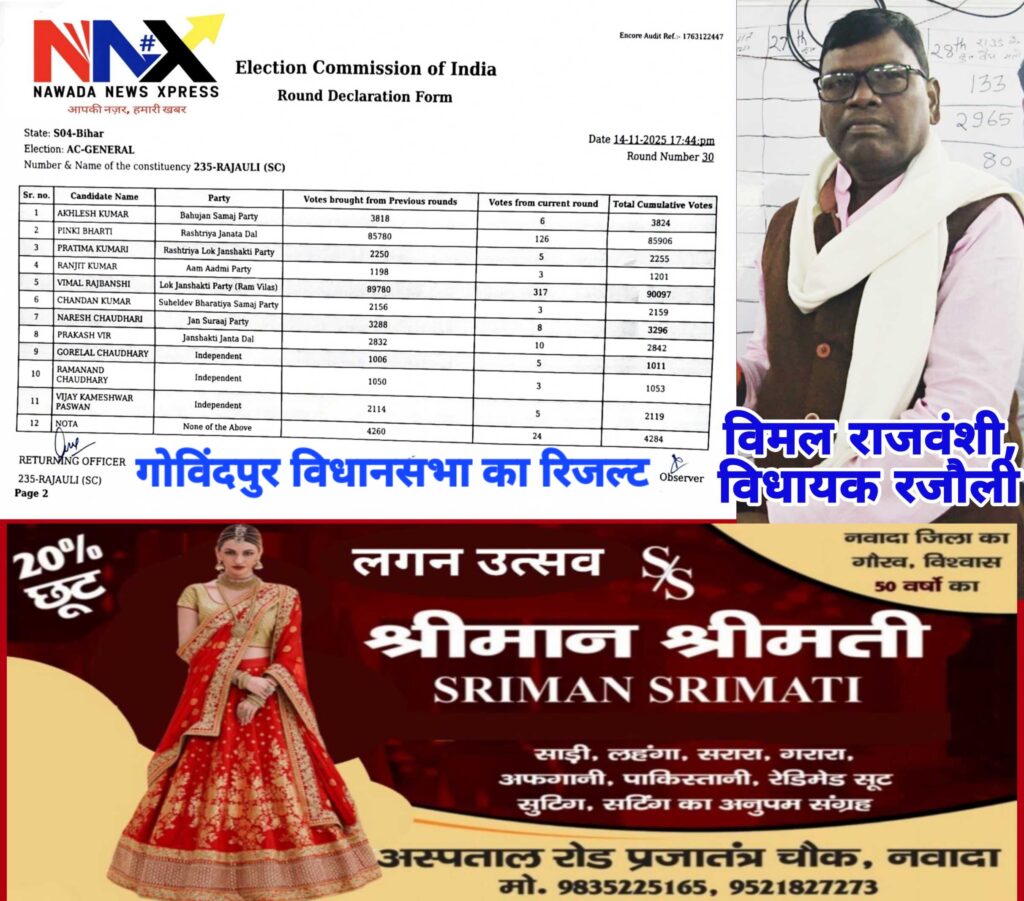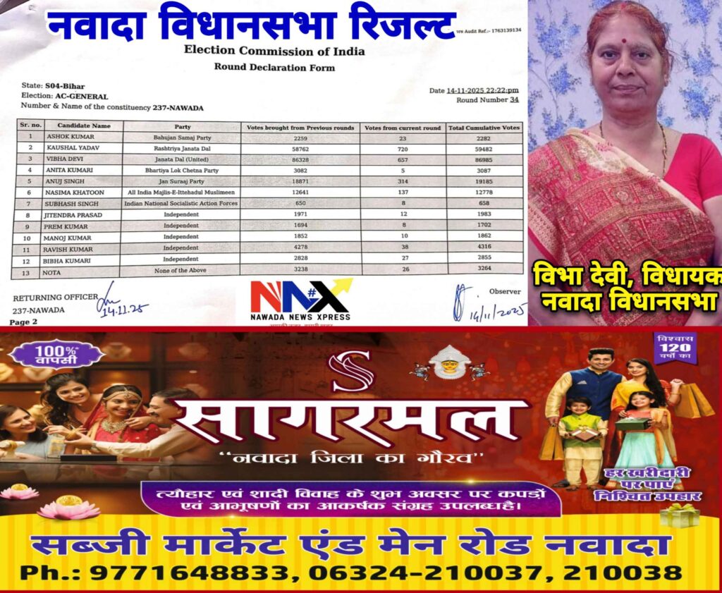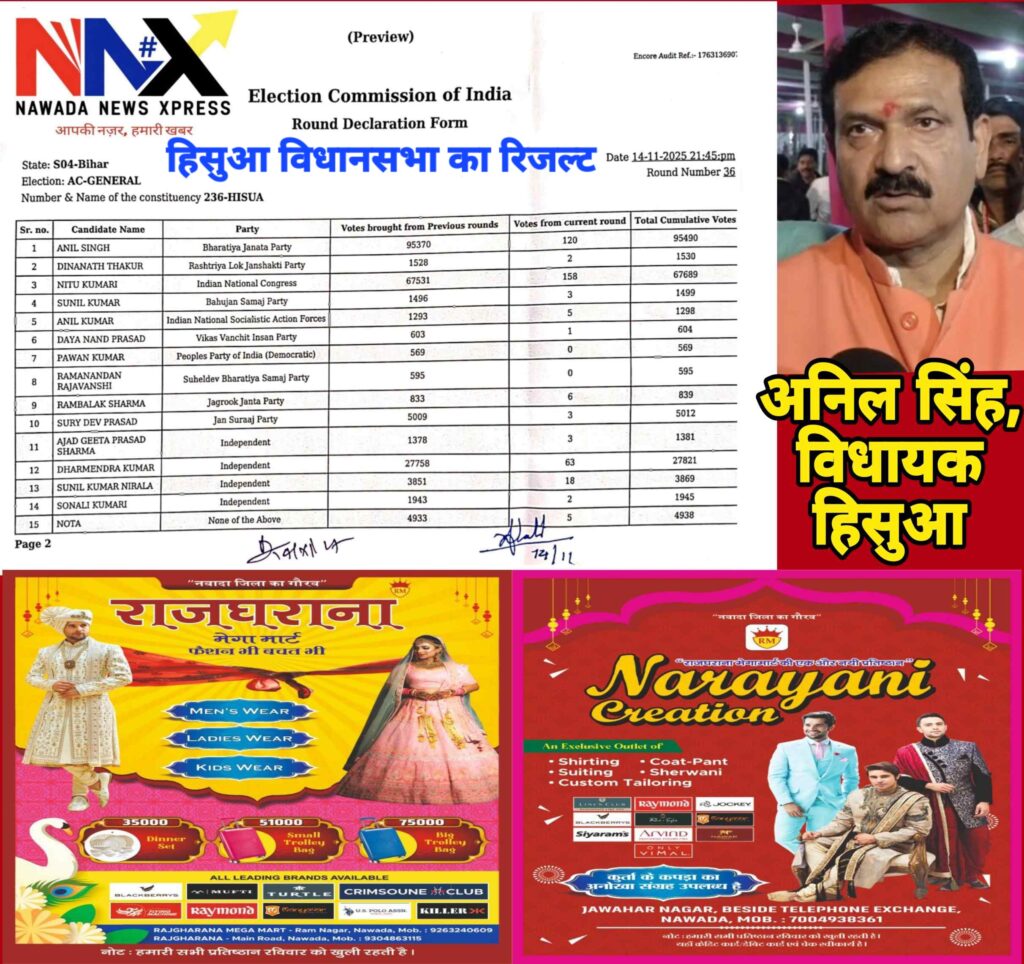 ⚡ Nawada News Xpress - आपकी नज़र, हमारी ख़बर ⚡ HomeBreaking Newsक्या आप अभी तक नहीं जान... Breaking NewsElectionPoliticsबिहार विधानसभा चुनाव 2025 क्या आप अभी तक नहीं जान पाएं हैं किस विधानसभा से किस प्रत्याशी को कितना मिला वोट, देखें पूरी खबर By Admin 18/11/2025 250 FacebookTwitterWhatsAppTelegram Report by Nawada News Xpress / नवादा / सूरज कुमार Tagsaaj takbiharbreaking news nawadalive nwdnawadanawada fatat newsnawada livenawada newsnawada news expressnwdnewsexpress.in Share FacebookTwitterWhatsAppTelegram Previous articleनवादा में एसटीएफ के सहयोग से 9 वर्षों से फरार किस हार्डकोर नक्सली को पुलिस ने किया गिरफ्तार, पढ़ें पूरी खबर Adminhttps://nawadanewsxpress.com RELATED ARTICLES Breaking News नवादा में एसटीएफ के सहयोग से 9 वर्षों से फरार किस हार्डकोर नक्सली को पुलिस ने किया गिरफ्तार, पढ़ें पूरी खबर 13/11/2025 Breaking News निष्पक्ष मतदान सुनिश्चित करने में नवादा पुलिस की बड़ी कार्रवाई, अपराधियों पर ऐसे कसा शिकंजा, पढ़ें पूरी खबर 10/11/2025 Breaking News जानिए, मतदान से पहले नवादा जिला प्रशासन ने पांचो विधानसभा में कैसे किया तैयारी पूरी, पढ़ें पूरी खबर 10/11/2025 Most Popular नवादा में एसटीएफ के सहयोग से 9 वर्षों से फरार किस हार्डकोर नक्सली को पुलिस ने किया गिरफ्तार, पढ़ें पूरी खबर 13/11/2025 निष्पक्ष मतदान सुनिश्चित करने में नवादा पुलिस की बड़ी कार्रवाई, अपराधियों पर ऐसे कसा शिकंजा, पढ़ें पूरी खबर 10/11/2025 जानिए, मतदान से पहले नवादा जिला प्रशासन ने पांचो विधानसभा में कैसे किया तैयारी पूरी, पढ़ें पूरी खबर 10/11/2025 विकास की नई राह पर नवादा:- जनसुराज प्रत्याशी डॉ. अनुज सिंह की जनसम्पर्क यात्रा में क्यों मिल रहा भरपूर समर्थन, पढ़ें पूरी खबर 08/11/2025 Load more Recent Comments