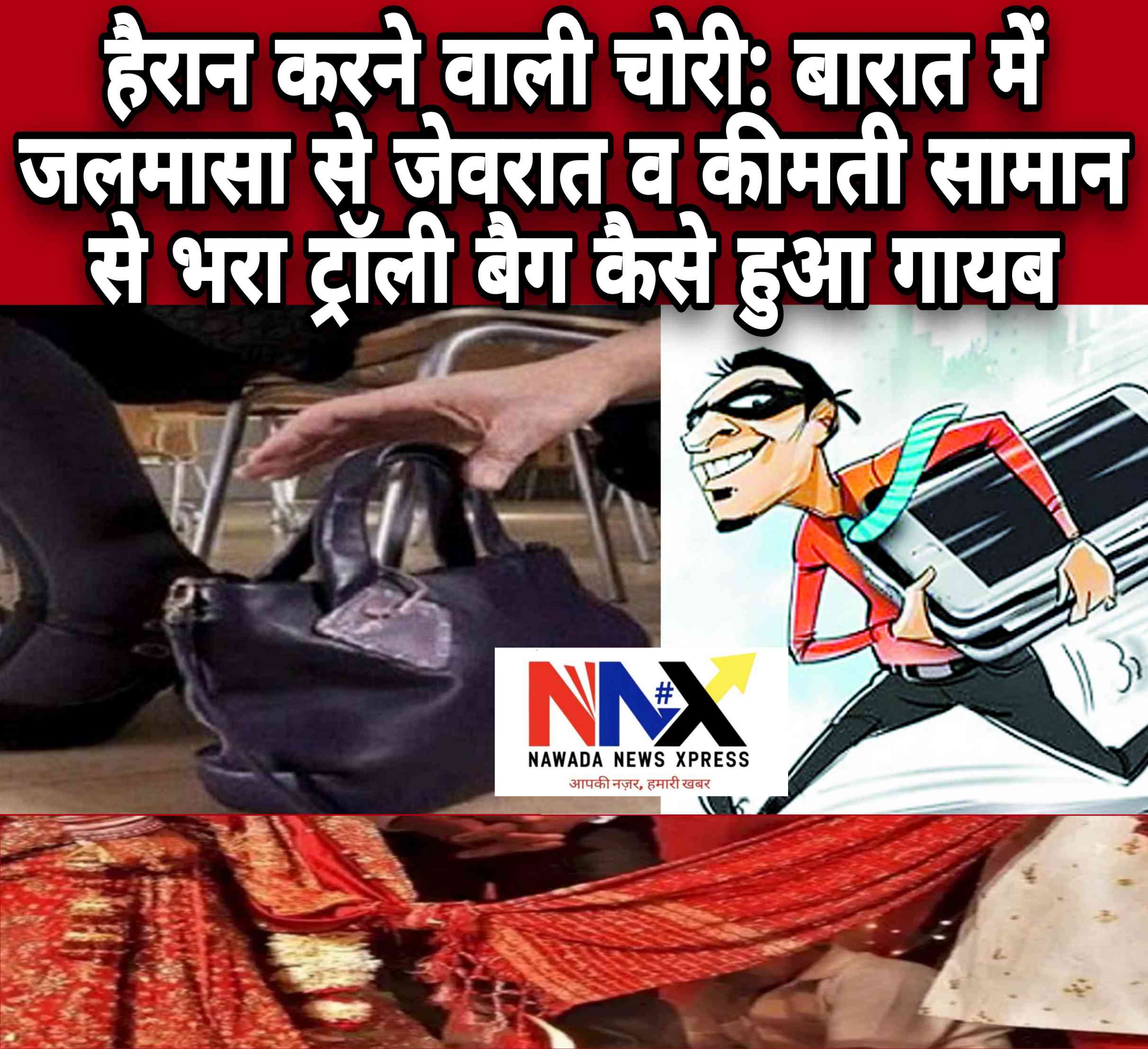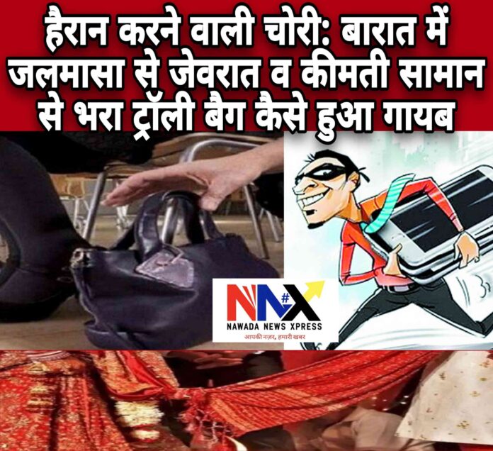 नवादा जिले के नरहट प्रखंड क्षेत्र के सहगाजीपुर गांव में आई एक बारात में सोमवार की रात उस समय हड़कंप मच गया, जब जलमासा में रखा जेवरात और कीमती कपड़ों से भरा ट्रॉली बैग अज्ञात चोरों द्वारा गायब कर दिया गया। चोरी की यह वारदात उस वक्त हुई, जब बारात में शामिल सभी लोग जयमाला समारोह में गए हुए थे और जलमासा पर केवल एक वृद्ध व्यक्ति मौजूद था।