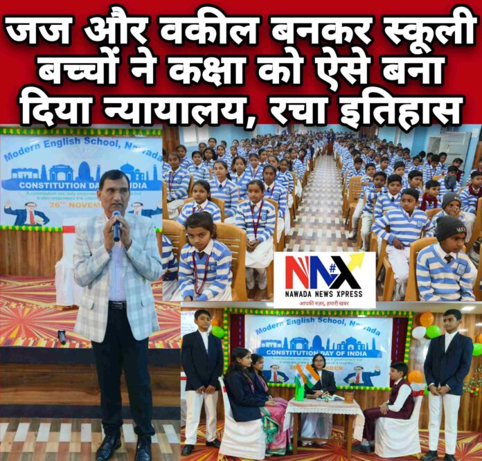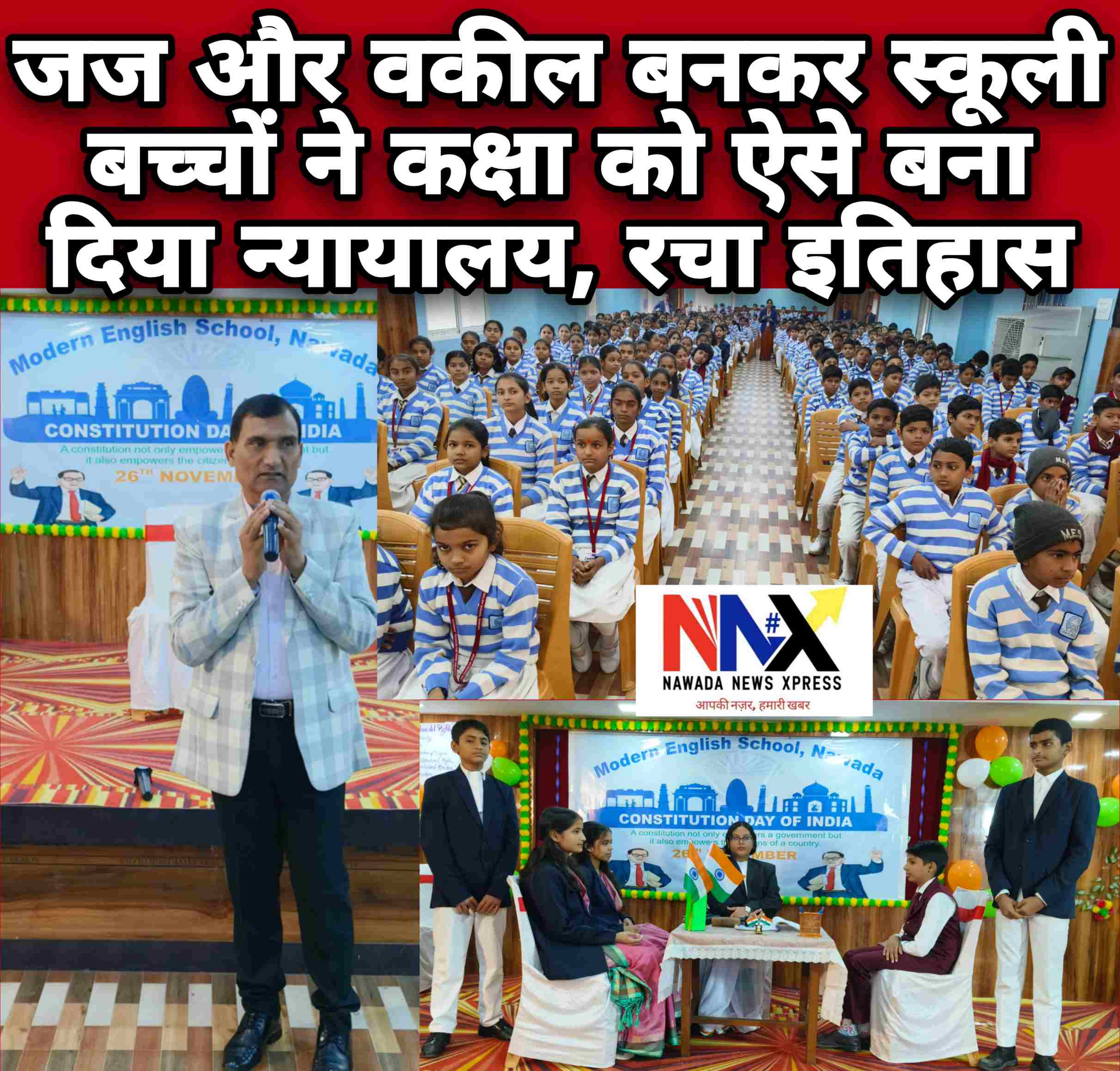 नवादा में मॉडर्न शैक्षिक समूह की शाखा न्यू मॉडर्न इंग्लिश स्कूल में 26 नवंबर 2025 को संविधान दिवस बड़े उत्साह और जागरूकता के साथ मनाया गया। इस अवसर पर विद्यालय के छात्रों ने भारतीय न्याय व्यवस्था पर आधारित एक प्रभावशाली नाटक का मंचन कर सभी का मन मोह लिया। नाटक में अदालत की वास्तविक कार्यवाही को जीवंत करते हुए न्यायिक प्रक्रिया को सरल और रोचक रूप में दर्शाया गया।