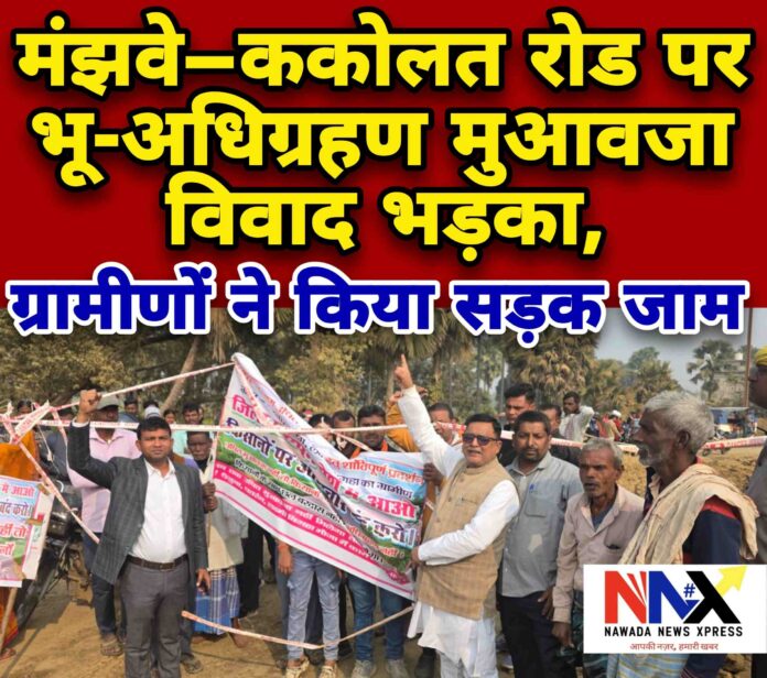 नवादा में मंझवे–ककोलत मुख्य पथ के सुदृढ़ीकरण एवं चौड़ीकरण कार्य के लिए अर्जित भूमि के उचित मुआवजे की मांग को लेकर अकबरपुर प्रखंड के पैजुना पंचायत के ग्रामीणों का आंदोलन मंगलवार को उग्र हो गया। बड़ी संख्या में प्रभावित रैयत ककोलत रोड पर जमे रहे और सड़क निर्माण कार्य को रोक दिया। आंदोलन का नेतृत्व सुबोध कुशवाहा, शैलेन्द्र कुमार, रंजीत कुमार सहित कई स्थानीय लोगों द्वारा किया गया। ग्रामीणों ने आरोप लगाया कि राजस्व एवं भूमि सुधार विभाग के स्पष्ट निर्देश और भूमि मुआवजा निर्धारण से जुड़ी समिति की रिपोर्ट के बावजूद उन्हें अब तक उचित मुआवजा नहीं मिल रहा है।