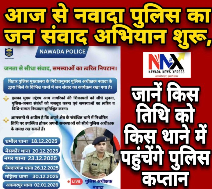 नवादा जिले में पुलिस-जनता के बीच विश्वास और संवाद को मजबूत करने की दिशा में एक अहम पहल की जा रही है। बिहार पुलिस मुख्यालय के निर्देशानुसार नवादा पुलिस अधीक्षक अभिनव धीमान द्वारा जिले के विभिन्न थानों में जन संवाद कार्यक्रम आयोजित किया जा रहा है।