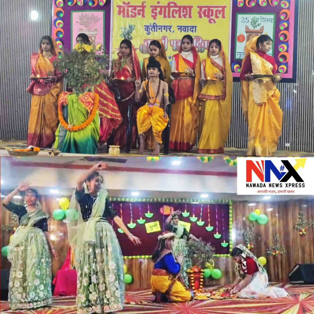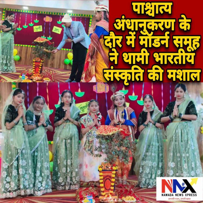 नवादा में स्कूली बच्चों ने पाश्चात्य सभ्यता को छोड़कर देसी सभ्यता का सन्देश दिया है। जहां एक ओर आज के दौर में अधिकांश शैक्षणिक संस्थान पाश्चात्य संस्कृति के अंधानुकरण में क्रिसमस ट्री और विदेशी परंपराओं को बढ़ावा दे रहे हैं, वहीं मॉडर्न शैक्षणिक संस्थान ने भारतीय सभ्यता और सनातन संस्कृति की मजबूत नींव को पुनः सशक्त करने का प्रेरक प्रयास किया। मॉडर्न समूह द्वारा संचालित सभी विद्यालयों में 25 दिसंबर को भव्य और श्रद्धापूर्ण तुलसी पूजन कार्यक्रम का आयोजन कर भारतीय सांस्कृतिक चेतना का संदेश दिया गया।