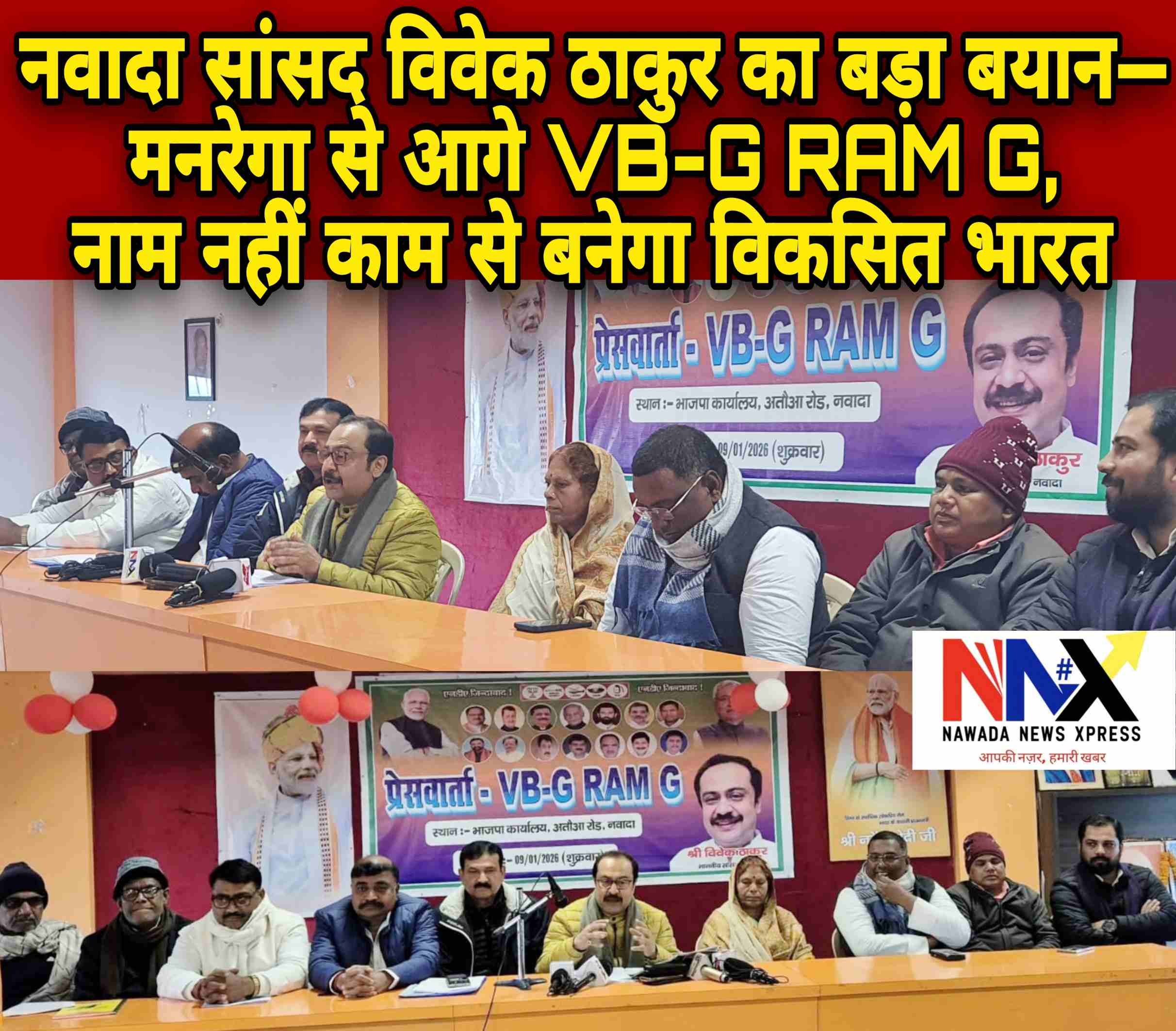 नवादा सांसद विवेक ठाकुर ने जिला भाजपा कार्यालय में आयोजित प्रेस वार्ता में ग्रामीण रोजगार योजना को लेकर विस्तृत जानकारी देते हुए कहा कि सरकार की नीति कभी नाम की राजनीति नहीं रही, बल्कि काम और परिणाम पर आधारित रही है। उन्होंने स्पष्ट किया कि Viksit Bharat – Guarantee for Rozgar and Aajeevika Mission (Gramin) यानी VB-G RAM G ग्रामीण भारत की बदली हुई जरूरतों के अनुरूप तैयार की गई एक दूरदर्शी पहल है। भाजपा कार्यालय में आयोजित प्रेसवार्ता की अध्यक्षता भाजपा जिलाध्यक्ष अनिल मेहता ने की, जिसमें एनडीए के सभी विधायक व जिलाध्यक्ष मौजूद रहे।