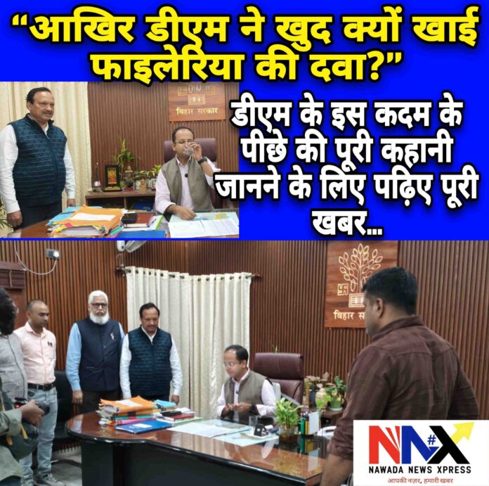 नवादा जिले में फाइलेरिया उन्मूलन को लेकर चल रहे मेगा एम.डी.ए. अभियान के बीच उस वक्त सबकी नजरें ठहर गईं जब नवादा के जिला पदाधिकारी रवि प्रकाश ने अपने ही कार्यालय कक्ष में फाइलेरिया रोधी दवा का सेवन किया। सवाल उठने लगा—आखिर डीएम को खुद दवा खाने की जरूरत क्यों पड़ी?