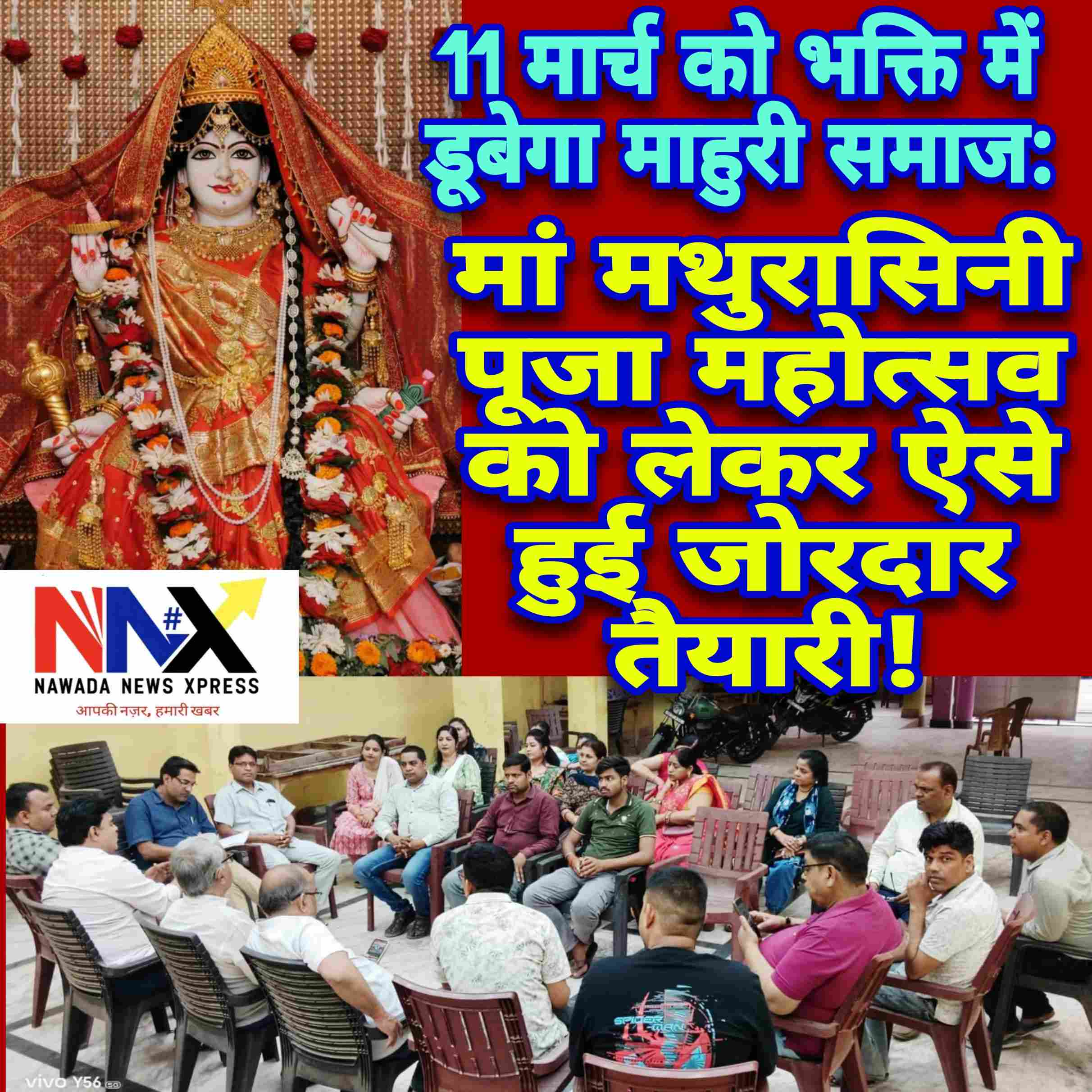 नवादा में माहुरी समाज की कुल देवी मां मथुरासिनी के पूजा महोत्सव को लेकर तैयारियां पूरी कर ली गई हैं। 11 मार्च 2026 को आयोजित होने वाले इस भव्य पूजा महोत्सव में पूजा-अर्चना, शोभा यात्रा, भंडारा, सामाजिक परिचर्चा तथा सांस्कृतिक कार्यक्रमों का आयोजन किया जाएगा।